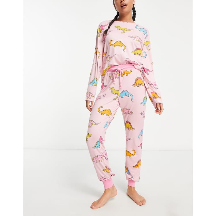 Chelsea Peers long sleeve and cuff pants pajama set in pink and blue dinosaur print | ASOS