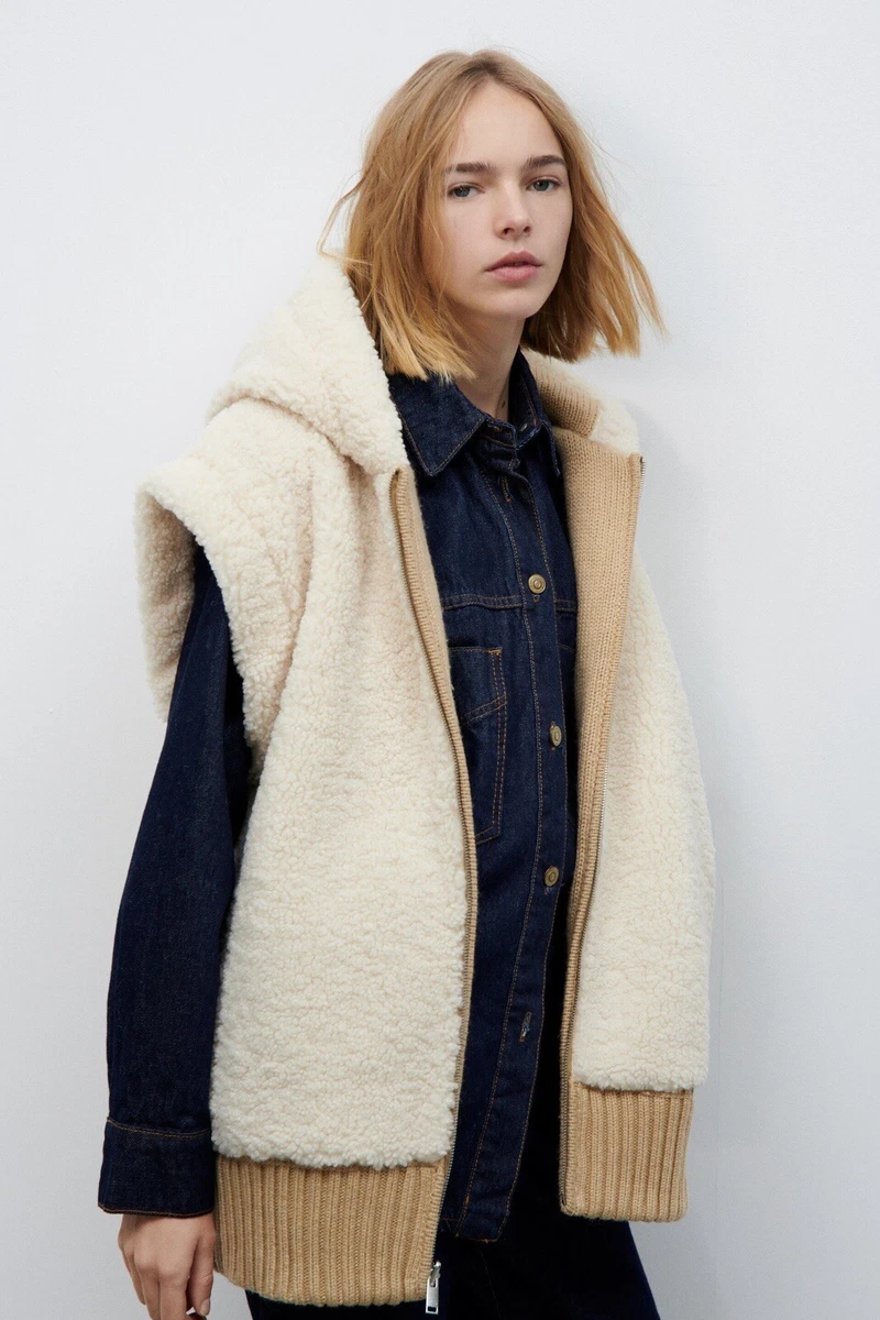 NWT Zara Sherpa Fleece Sweater Knit Reversible Teddy Hooded Zip Vest M $119 | eBay